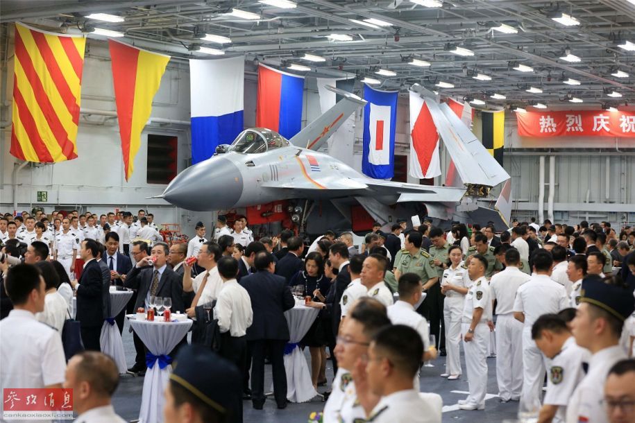 辽宁舰上举行的盛大欢迎宴会。可以看到机库中停放的歼-15战机。