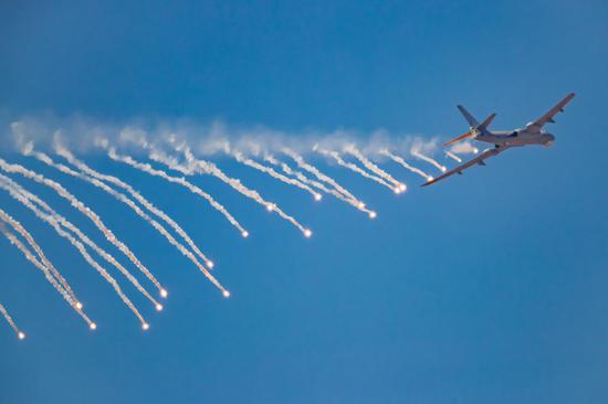 上图是能见度良好的情况下,轰六轰炸机发射热焰弹的场景。