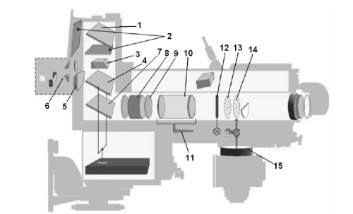1 –稳定上反射镜; 2 – 防护玻璃; 3 –分光棱镜; 4 –分光平面镜; 5 –转像棱镜; 6 – 激光测距仪准直仪; 7 –稳定下反射镜; 8 – 物镜; 9 – 滤光片; 10 –变焦系统; 11 – 倍率放大驱动; 12 –照明分光镜; 13 – 固定栅极板; 14 – 活动栅极板; 15 –手动输入距离机构(手动装表)