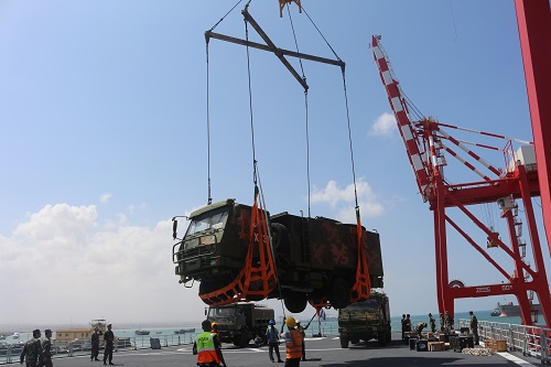 资料图:这是中国人民解放军驻吉布提保障基地联合先遣组在吉布提港口抢卸车辆装备的资料照片。 新华社发