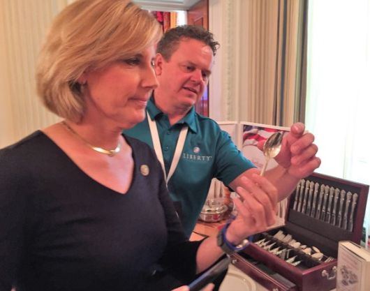 据报道,当时罗伯茨站在白宫国宴厅的一个角落里,展示其公司的“Liberty Tabletop”系列餐具样品,众议员克劳迪娅?坦尼突然拿着一把勺子冲了过来。