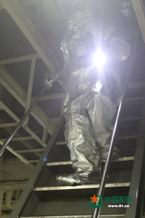 “主机舱起火,损管人员组织灭火!”尖锐急促的警铃声在李四光舰骤然响起,损管人员迅速携带装具奔赴“火灾”现场。