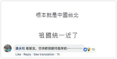 同时,多数台湾网友显然对台当局的言行也并不认同。有网友表示,“根本就是中国台北”、“祖国统一近了”。
