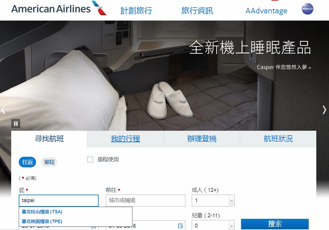 美国航空网站首页已没有“台湾”(美国航空官网截图)