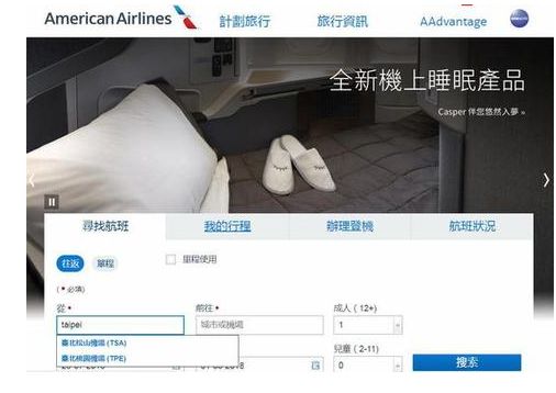 美国航空网站首页已没有“台湾”(美国航空官网截图)