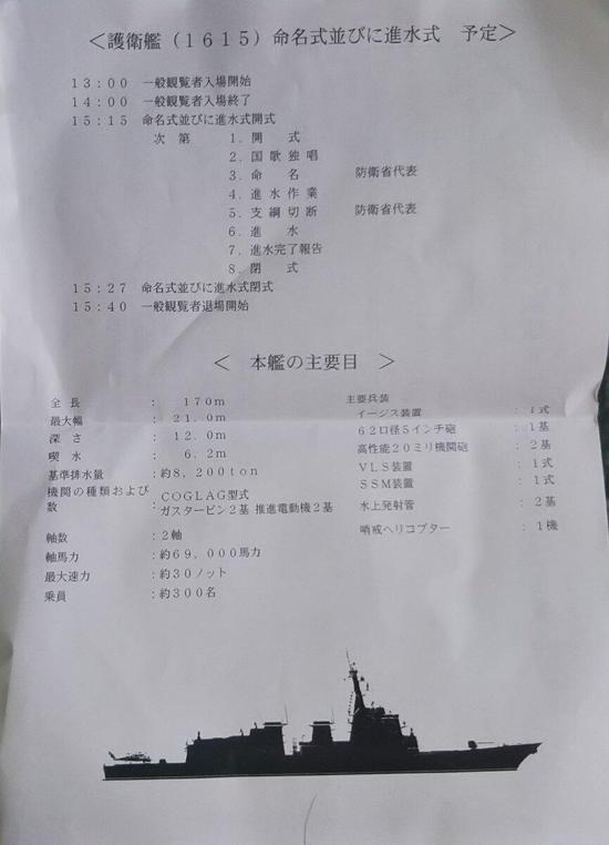 根据在社交媒体上流传的图片,自卫队在下水仪式的流程单上也公开了该舰的其他一些数据: