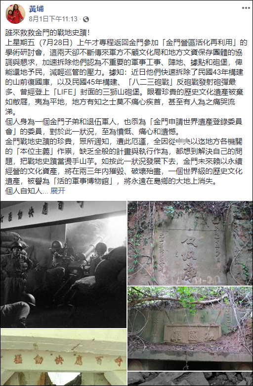 8月1日,曾任台军陆官教育长、陆军高中校长的备役中将黄奕炳以“谁来救救金门的战地史迹”为题在脸书发文称,7月28日上午才专程返回金门参加“金门营区活化再利用”的学术研讨会,这两天却不断传来军方不顾“金门文化局”和地方文化资产保存团体的协调与恳求,加速拆除他们认为不重要的军事工事、阵地、据点和碉堡,才能还地予民,减轻巡管压力。