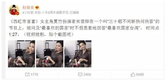 事件的简要过程是,多名网友昨日在微博上爆料宋芸桦此前在台湾娱乐节目中的一段视频。