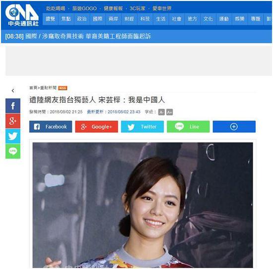 在宋芸桦发表声明后,台湾“中央社”发布消息。标题十分客观:“遭陆网友指台独艺人,宋芸桦:我是中国人”↓