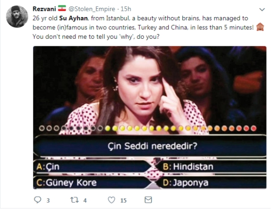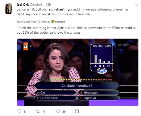 事情是这样的,据《土耳其每日新闻》6日报道,一位名叫Su Ayhan的来自伊斯坦布尔的经济学专业毕业生,出现在了8月4日那期土耳其版《百万富翁》的节目上。