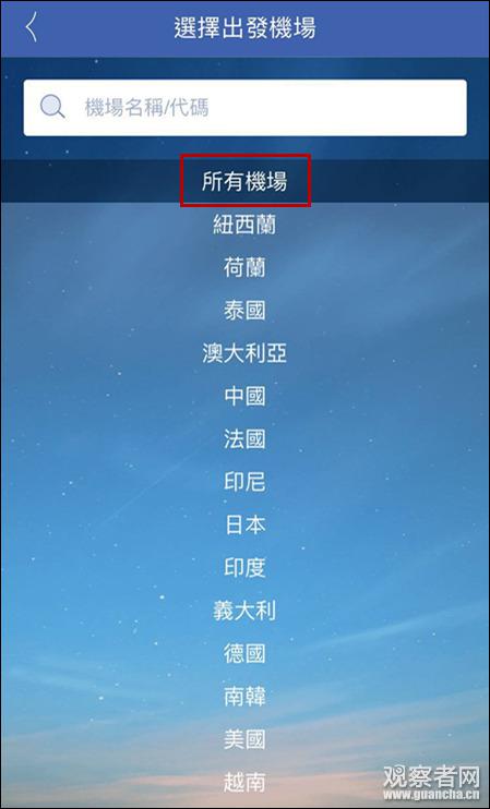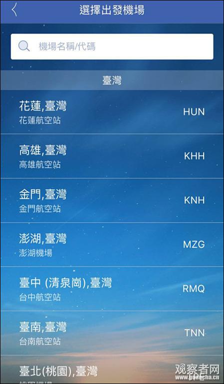 在其手机APP上,“所有机场”中有“台湾”选项,二级菜单中包括台湾各大机场。