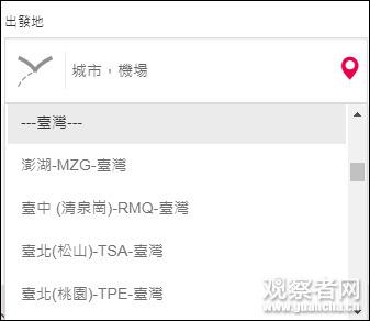 登陆中华航空的官网,在出发地一栏,并未区分国家和地区,仅注明了城市及机场。下拉可以发现,台湾的机场被归类在“台湾”,而非“中华民国”。大陆的城市标注的是“中国”。