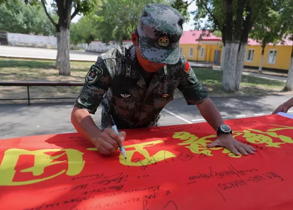 中国参赛队领队韦韬副旅长在战旗上写下中国必胜。