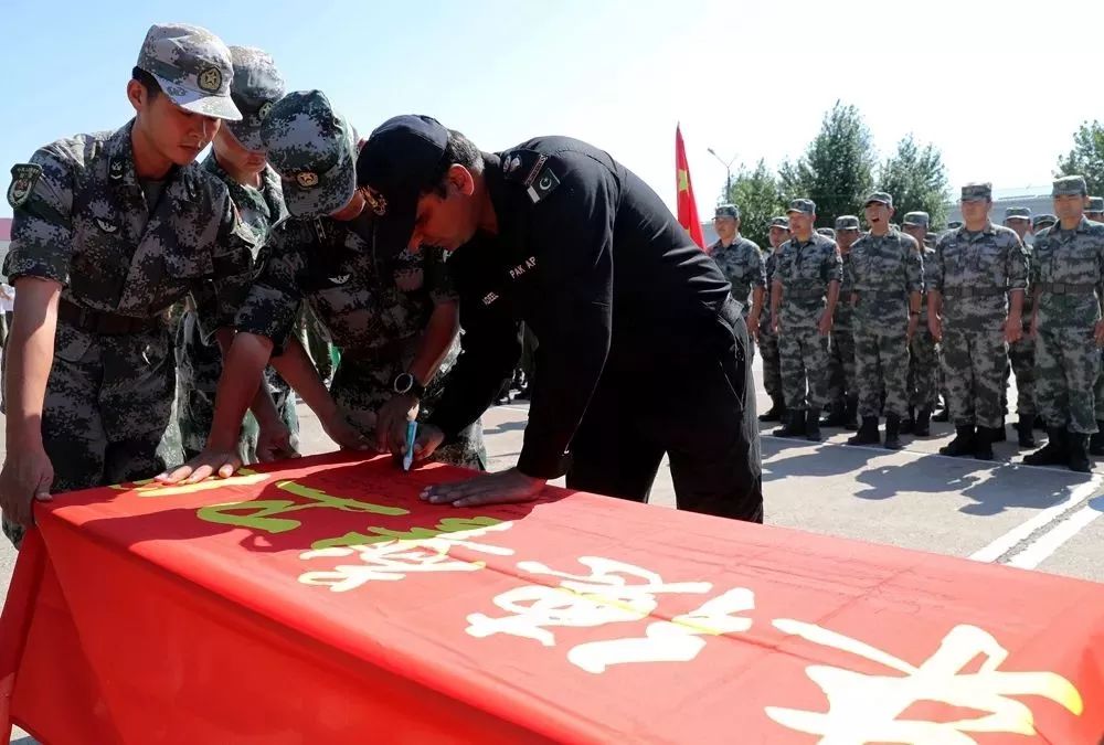 巴基斯坦参赛队领队在“朱德警卫团”战旗上签字。