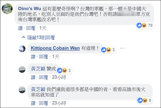 命名为“台北舰”是“吃豆腐”?至少很多台湾网民并不这么认为,他们直接在台媒的报道下怼了回去,表示且不说台湾不少军舰以大陆地名命名,就连台湾的街道,以大陆地名命名的也不在少数。