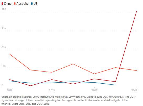 然而,由于2017年中国承诺向该地区提供的援助是澳大利亚的4倍多,因而中国有望在今年超过澳大利亚成为南太地区最大的援助国。