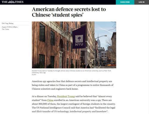 《泰晤士报》有关“留学生间谍论”的报道。
