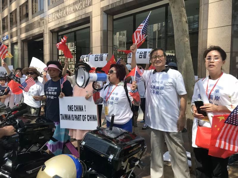 他们标语的核心词汇包括:反对“台独”,抗议蔡英文“过境”,中国必定统一。