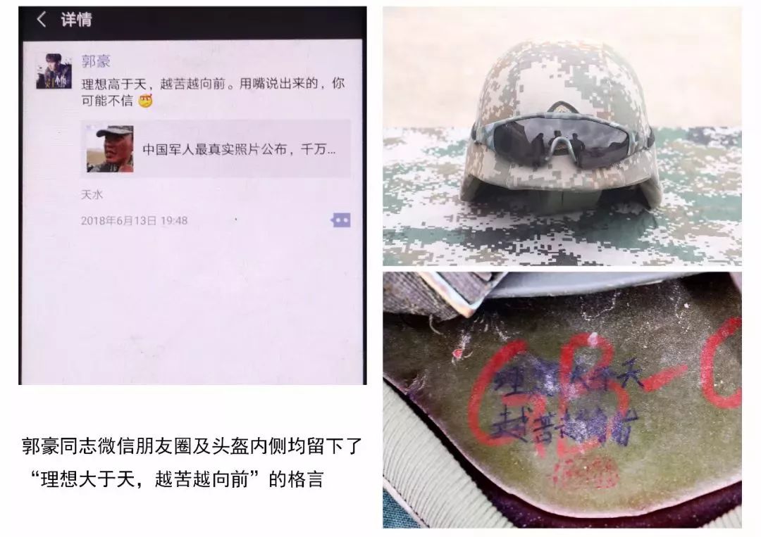 ▲烈士郭豪在生前朋友圈和头盔内侧均写着“理想大于天,越苦越向前”