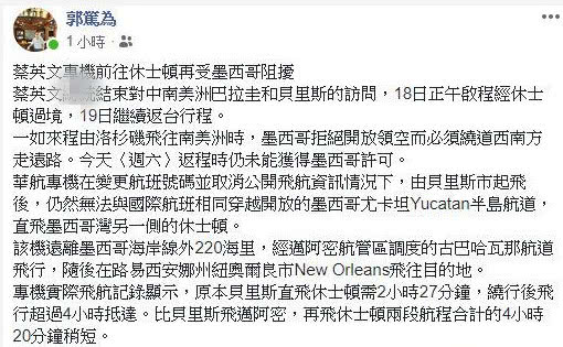 [环球网综合报道]台湾地区领导人蔡英文于当地时间18日上午结束访“友邦”伯利兹的行程,搭机前往美国休斯顿。不过,据香港中评社8月19日报道,台湾长驻拉丁美洲的资深媒体人郭笃为19日再度在脸书上发文称,蔡英文的专机前往休斯顿时再受墨西哥的“阻扰”,一如去程蔡英文由洛杉矶飞往南美洲时,墨西哥拒绝开放领空,必须绕道西南方走远路,返程时其专机依旧未能获得墨西哥许可。