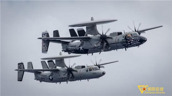 2017年2月9日,西太平洋上,隶属第113“黑鹰”舰载预警机中队的两架E-2C型“鹰眼”预警机在一个仪式上飞越美国海军“卡尔·文森”号航母。 美国海军图片