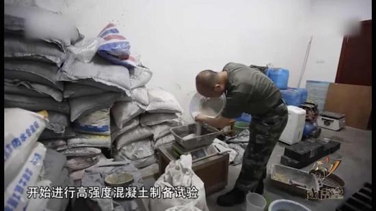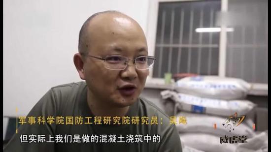 吴飚(军事科学院国防工程研究院研究员):我们表面上和民工很类似,做的都是混凝土的浇筑,但实际上我们是做的混凝土浇筑中的混凝土配比的研究,材质不同,配方相同,它这个结果也不一样。