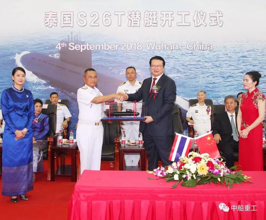 9月4日,泰国S26T潜艇项目在中船重工武昌船舶重工集团有限公司武昌基地开工。中国船舶重工集团有限公司董事长胡问鸣、泰国海军司令纳里斯上将赴开工现场并致辞。国家国防科技工业局副局长徐占斌,国家国防科技工业局军贸与外事司司长韩大明,中央军委装备发展部装备技术合作局副局长冯辉,中央军委国际军事合作办公室亚洲局副局长刘芳,海军装备部副部长魏刚,海军装备部潜艇装备局局长高峰等莅临现场,集团公司总经理助理、中国船贸董事长徐子秋主持开工仪式。