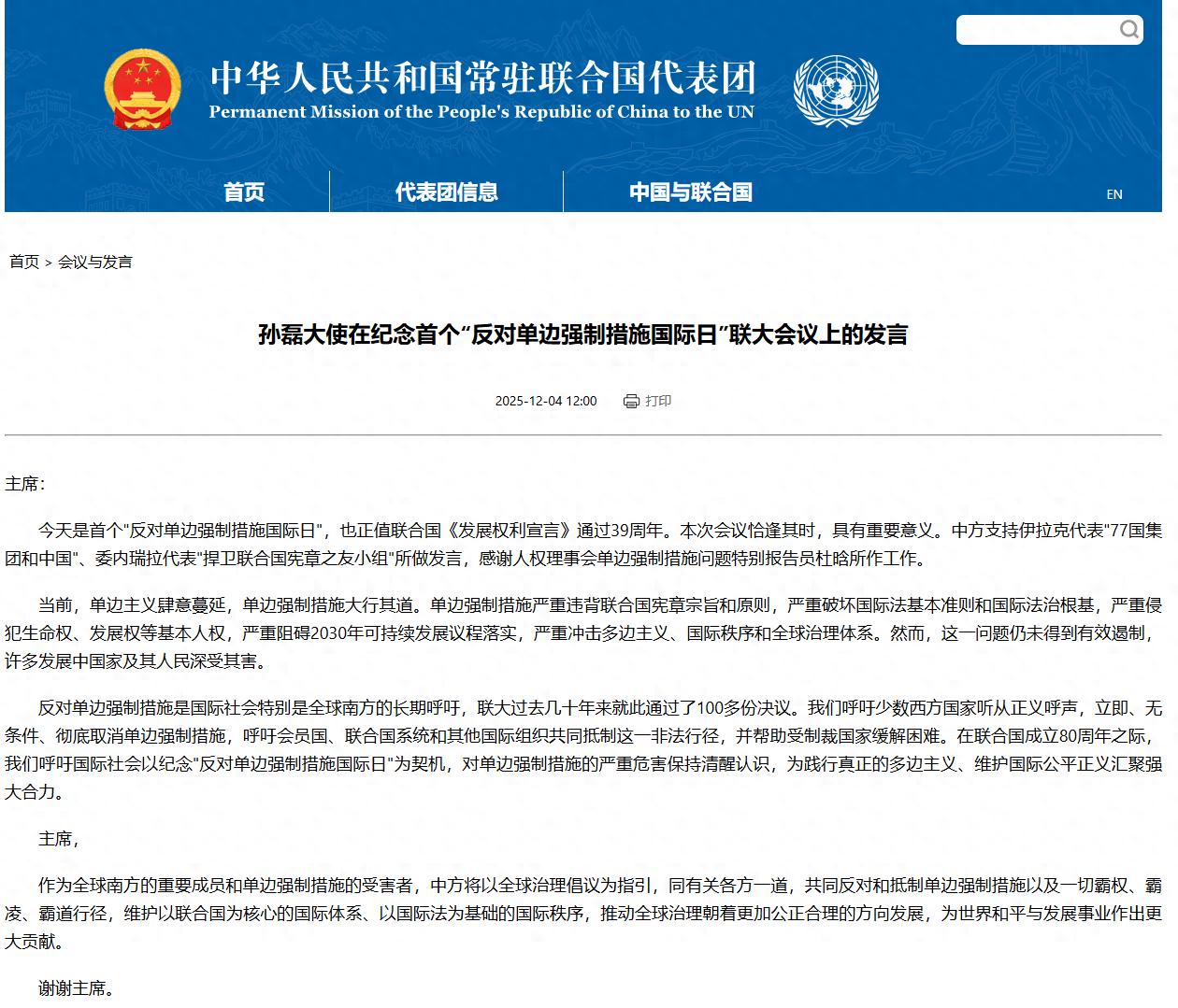 据中国常驻联合国代表团网站消息,当地时间12月4日, 联合国大会举行首个纪念“反对单边强制措施国际日”会议。中国常驻联合国副代表孙磊在会上发言,呼吁少数西方国家立即、无条件、彻底取消单边强制措施。