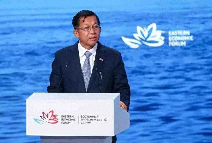 缅甸前代总理敏昂莱在2022年俄罗斯第7届东方经济论坛上发言称,“在我看来,人民币和卢比等货币都可以在全球贸易中使用。此外,直接易货贸易也可以取代美元。”图源:缅甸中文网