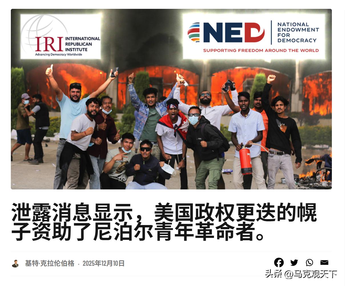 按照美国独立调查记者基特·克拉伦伯格说法,在2025年9月的尼泊尔政变期间,美国家民主基金会NED起到了关键作用,因为骚乱组织者骨干,曾接受过美国特训。