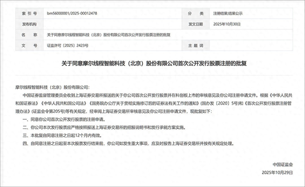 此前10月30日,证监会官网发布了关于同意摩尔线程智能科技(北京)股份有限公司(下文简称为“摩尔线程”)首次公开发行股票注册的批复,同意摩尔线程科创板IPO注册申请,批复自同意注册之日起12个月内有效。
