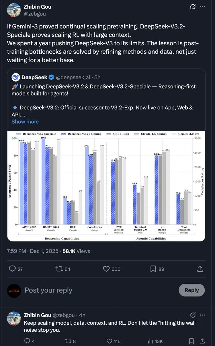 模型发布后,DeepSeek研究员Zhibin Gou在X上发文:“如果Gemini-3证明了持续扩展预训练的可能性,DeepSeek-V3.2-Speciale则证明了在大规模上下文环境中强化学习的可扩展性。我们花了一年时间将DeepSeek-V3推向极限,得出的经验是:训练后的瓶颈需通过优化方法和数据来解决,而非仅等待更好的基础模型。”