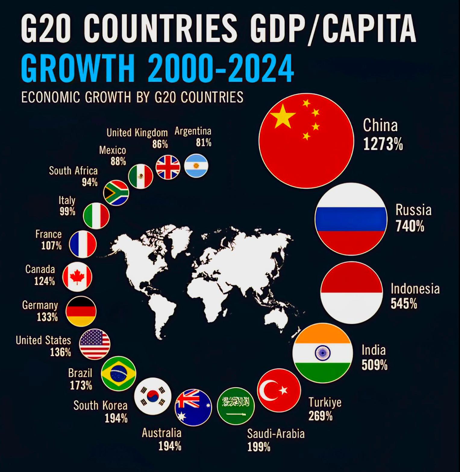 根据世界银行统计的数据,G20国家在2000-2024年的经济增长率,连增长最慢的阿根廷都增长了81%,中国更是以1273%的增长率冠绝全球。这张图中不包括日本是因为日本GDP是负增长。G20还包含欧盟全体,这张图上也没画。