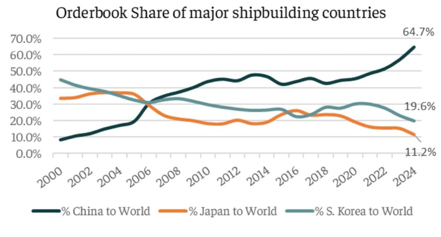再次是中韩工业的崛起,直接打击了日本曾经占据优势的产业。造船业就是一例:日本造船业曾经与韩国一起占据全球市场大部分份额,但随着中国的崛起,2024年中国造船业占全球市场64.7%,韩国占19.6%,日本仅剩下11.2%。