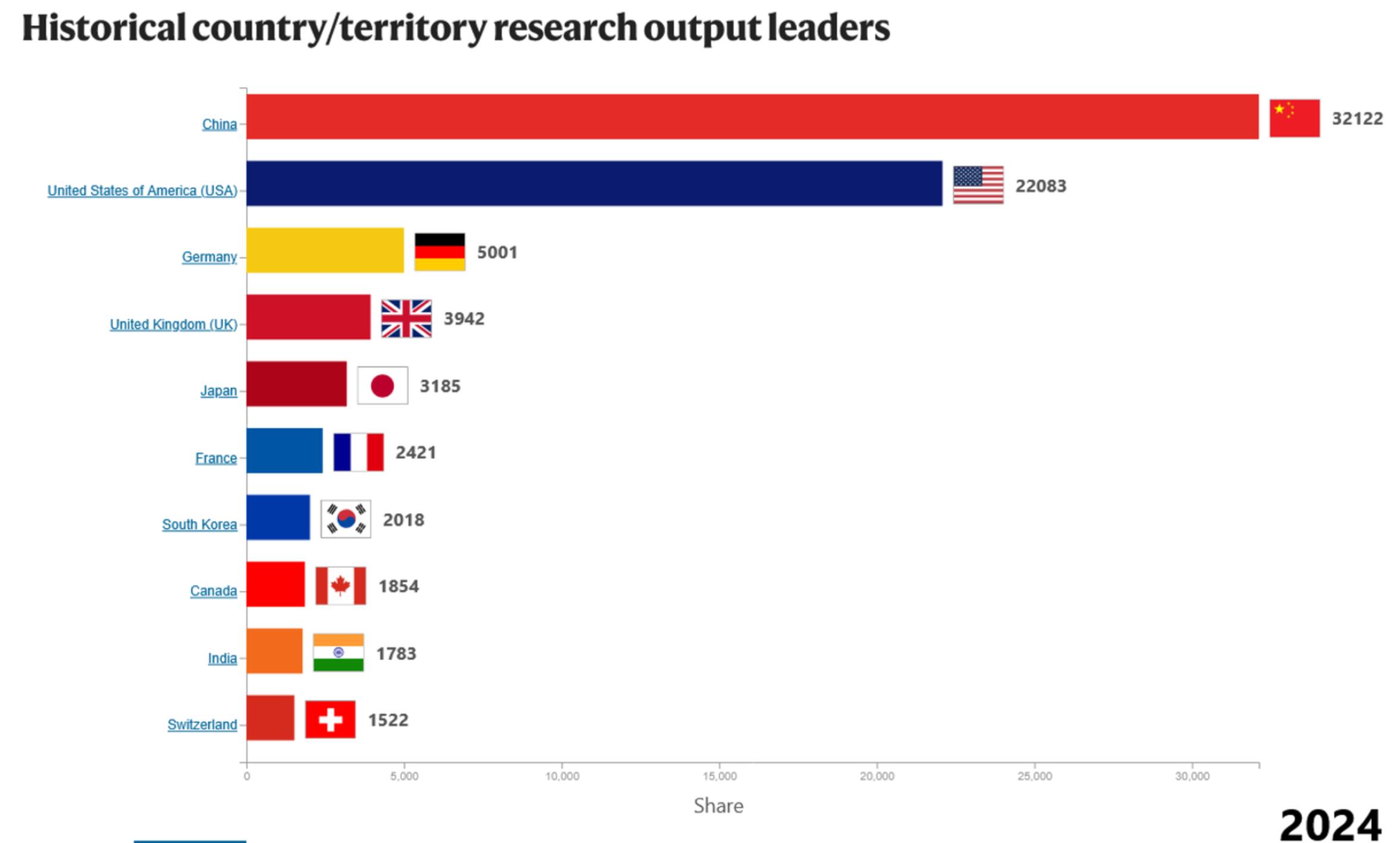 (自然指数NatureIndex2024年的数据,中国已经是日本的10倍)