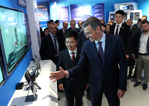 4月13日,西班牙首相桑切斯在中国科学院大学体验机械臂。 《中国日报》