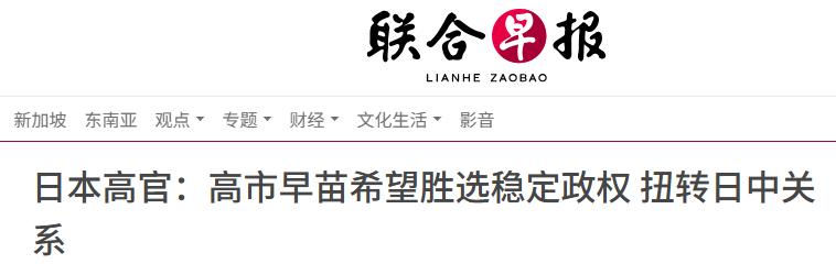 高市早苗身边的一名官员告诉日本《朝日新闻》称,“高市早苗希望通过赢得众院选战,来建立强大的政治基础,从而打破中日关系的僵局。如果能够获胜,取得稳定政权,就能期待中国的态度也会有所改变”。