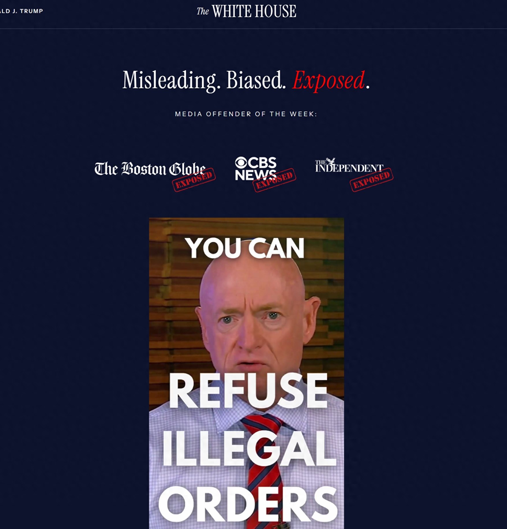 “媒体违规者”网页也写道:“民主党人和假新闻媒体破坏性地暗示特朗普总统向军人发布了非法命令。特朗普总统发布的每一道命令都是合法的。现任国会议员煽动美国军方不服从是危险的,特朗普总统要求他们承担责任。”