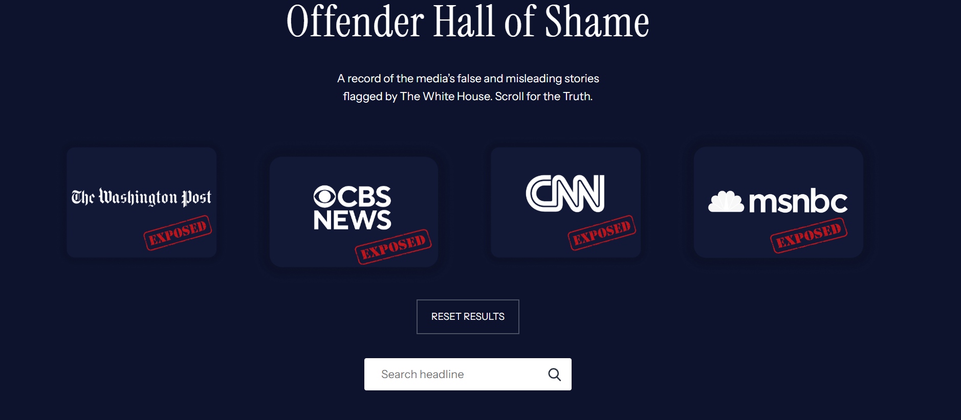 该网页还设有一个“违规者耻辱堂”,列出的媒体包括《华盛顿邮报》、哥伦比亚广播公司新闻网、美国有线电视新闻网(CNN)以及微软全国广播公司(MSNBC)。