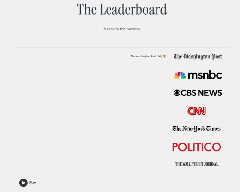 《华盛顿邮报》目前被列为头号违规者,MSNBC和CBS News分列第二和第三。美联社、《纽约时报》、《华尔街日报》、“政客新闻网”、Axios也被列为“惯犯”。