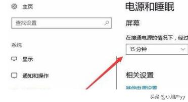4、窗口中屏幕关闭时间下拉菜单中,选择一个较短的时间,这样可以为我们自动关闭电脑显示器,节约电力。