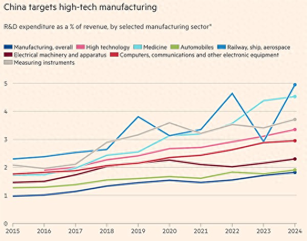 近年来,中国加大对高新制造业的投入。 《金融时报》制图