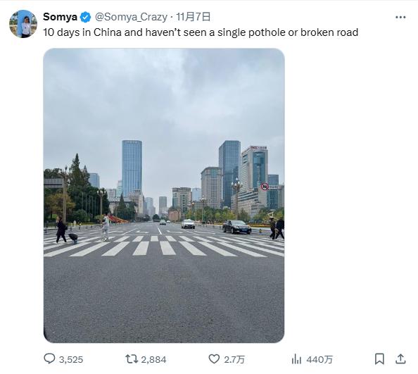 随着直航的有限恢复,部分印度人士得以亲身体验中国的发展现状。11月初,一位名叫索姆娅(Somya)的X用户在社交媒体上发布的“来中国十天未见道路坑洼”的推文获得超400万浏览量,引发印度网民热议中印基建差距。有不少印度网民直呼“中国比我们领先几十年”。