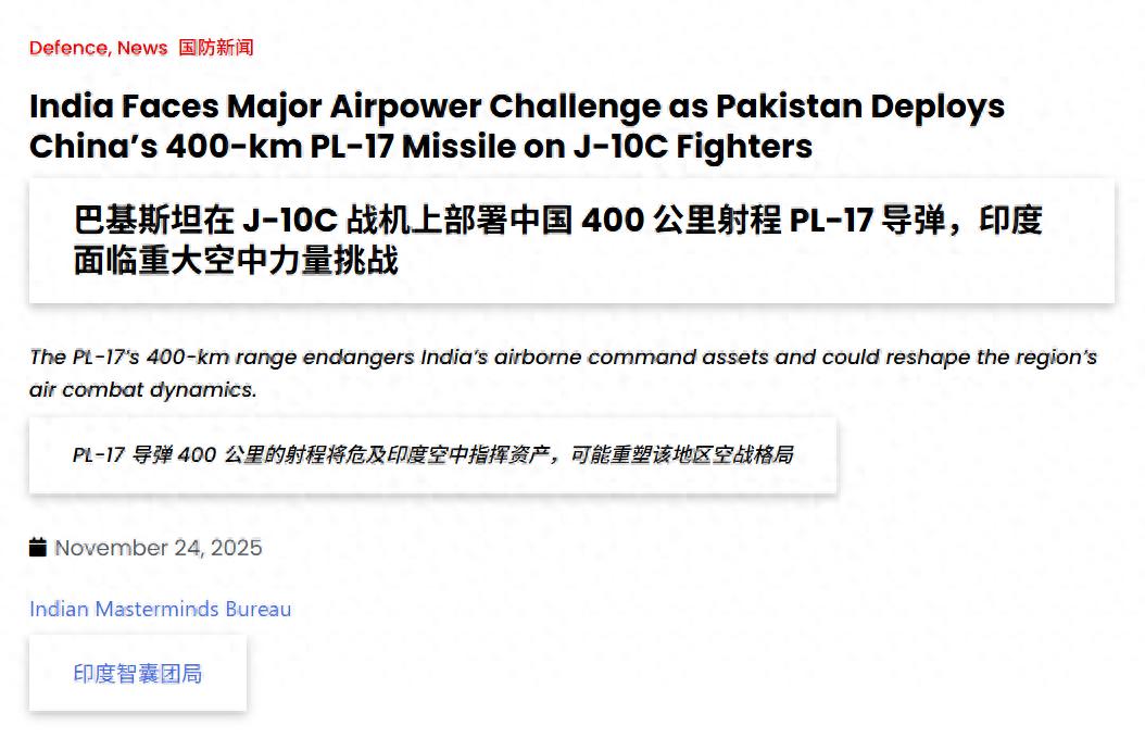 这个消息对于刚在今年5月印巴冲突中吃了亏的印度空军来说,无异于雪上加霜。要知道,巴基斯坦空军在那场冲突中已经用霹雳-15导弹给印度人好好上了一课,现在要是再配上射程更远的霹雳-17,印度空军那些宝贝疙瘩——预警机和空中加油机——可就真成了天上的活靶子。