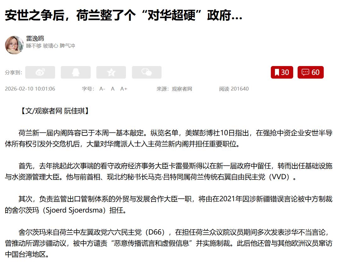 更值得玩味的是时间点。本周一,荷兰新一届内阁阵容基本敲定,大量对华鹰派人士入阁。两天后,企业法庭就作出了不利于中企的裁决。