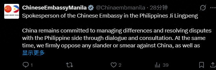 17日,中国驻菲律宾大使馆发言人季凌鹏在社交媒体指出,中方始终致力于通过对话协商管控与菲方的分歧、解决争端;同时坚决反对任何诽谤、抹黑中国以及煽动仇恨的不负责任言论。