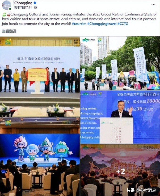 在海外社交媒体平台,重庆积极开展主动传播,展现开放合作的海外形象。如11月17日,重庆账号在脸书平台发布图文网帖称:“重庆文旅集团启动2025全球合作伙伴大会。地方美食和旅游景点展位吸引市民关注,国内外旅游合作伙伴携手推动重庆走向世界。”