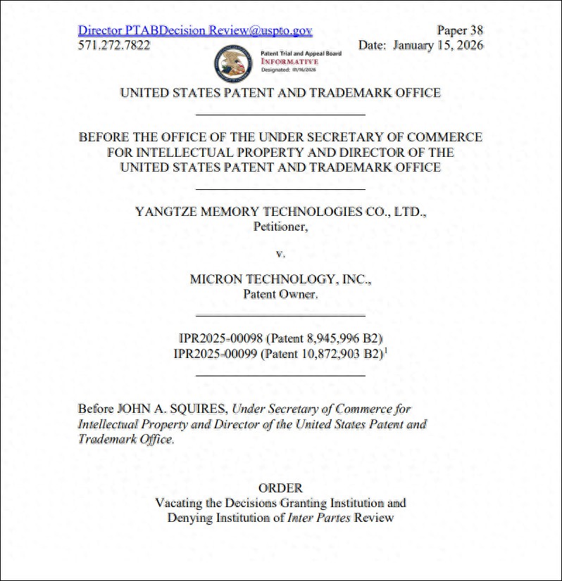 美国专利商标局(USPTO)近期披露的一项正式裁定显示,该局已撤销了此前准予对美光科技的两项重要专利进行多方复审(IPR)的决定,并且驳回了长江存储发起的专利无效请求。