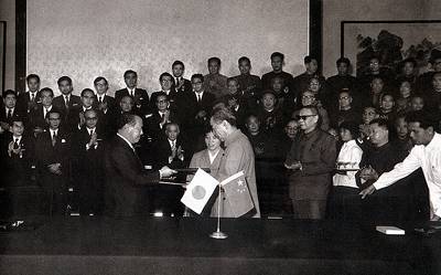 1972年9月29日上午,《中华人民共和国政府和日本国政府联合声明》签字仪式在北京人民大会堂西大厅举行。中国总理周恩来、外交部部长姬鹏飞和日本首相田中角荣、外务大臣大平正芳,分别代表本国政府在联合声明上签字。