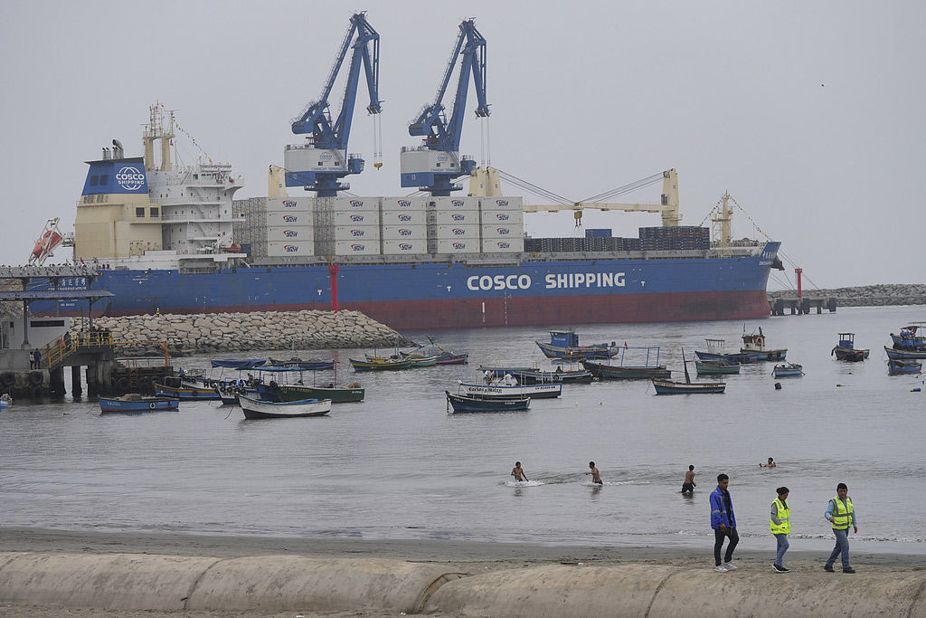 2024年11月12日,秘鲁钱凯港停靠着一艘货船。 视觉中国